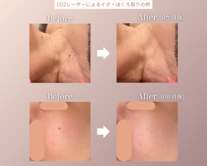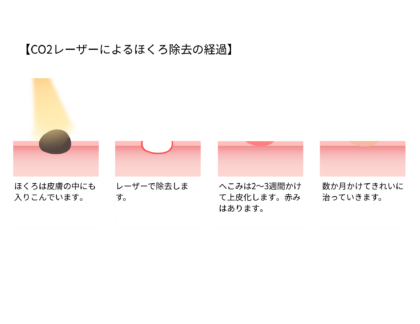 CO2レーザー(炭酸ガスレーザー)という医療レーザー機器を使用し、患部にレーザー照射をすることで、組織を蒸散させてイボやほくろを除去する施術です。イボ・ほくろ・盛り上がったシミをピンポイントに除去でき、切開に比べて傷跡が目立血にくく、痛みや出血も少ないのが特徴です。