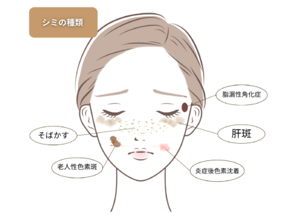 化粧かぶれやニキビ、湿疹、やけど、傷など、皮膚の炎症が原因でできるシミです。紫外線の影響で悪化して濃くなることがあるため、早めのケアと紫外線対策が大切です。